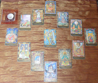 Készüljünk fel a kártyavetésre, csendesítsük el gondolatainkat, gyújtsunk mécsest vagy gyertyát, keverjük meg a nagy Arkánum lapjait, és közben gondoljunk a kérdésre pl.: mire számíthatok az előttem álló évben? Majd húzzunk ki 12 kártyát, (minden hónapnak egy-egy lapot) figyelve a sorrendre. Tegyük le egymás mellé vagy kör alakban a lapokat, és értelmezzük őket. Ha ez megvan, húzhatunk egy 13. kártyát is, ami az évet általánosságban jellemzi.